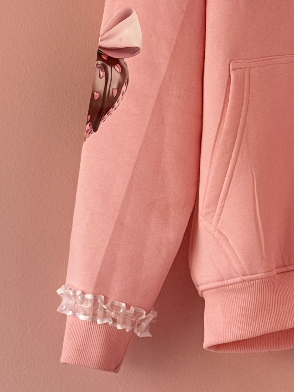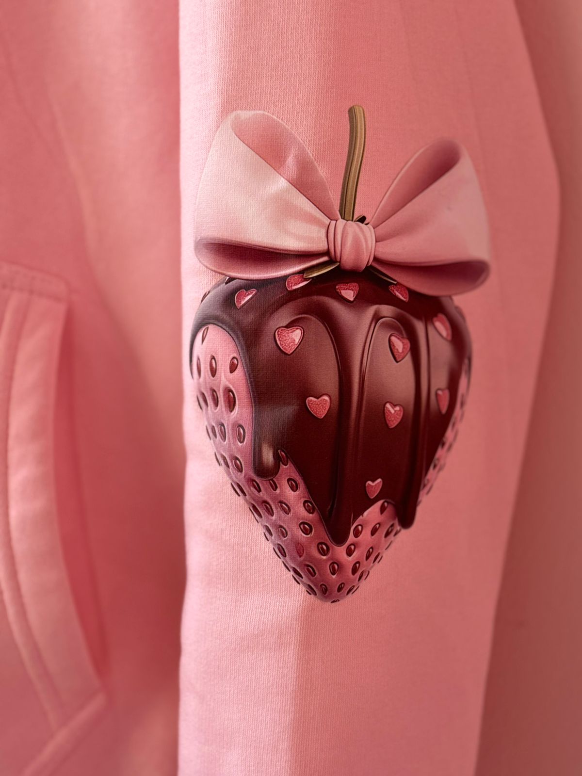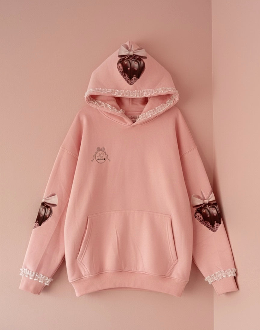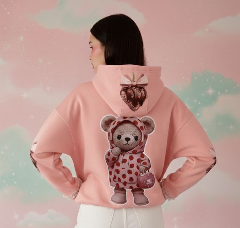 * Signature Graphics: Features a large, adorable teddy bear mascot on the back wearing a strawberry-print hoodie, complemented by chocolate-dipped strawberry motifs on the sleeves and hood.